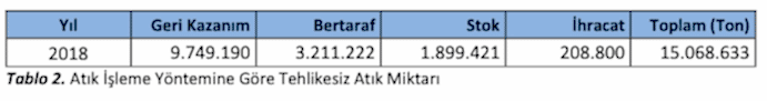 2018 yılında geri kazanım amacıyla atık işleme tesislerine gönderilen atık miktarı 9.749.190 ton, bertaraf edilmek üzere atık işleme tesisine gönderilen atık miktarı ise 3.211.222 ton olarak gerçekleşmiştir. Yılsonu itibariyle tesiste stok olarak tutulan tehlikesiz atık miktarı 1.899.421 ton, ihraç edilen tehlikesiz atık miktarı ise 208.800 ton olarak gerçekleşmiştir.