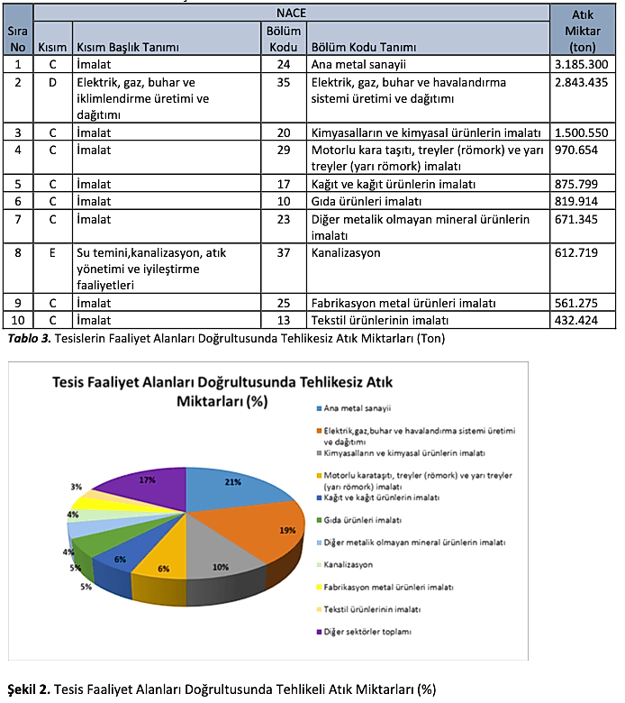 TABS’a yapılan beyanlar doğrultusunda en çok tehlikesiz atık oluşturan 10 sektör ve toplam tehlikesiz atık miktarları aşağıdaki tabloda verilmektedir. Sektör bilgisi için NACE Rev.2 altılı ekonomik faaliyet sınıflaması kullanılmıştır. 2018 yılında 81 adet NACE bölüm kodunda faaliyet gösteren tesisler beyan gerçekleştirilmiştir. En yüksek atık oluşumunun 3.185.300 ton ile imalat sektörü/Ana metal sanayii bölümünde yer alan tesislere ait olduğu görülmektedir. En yüksek tehlikesiz atık oluştuğu beyan edilen 10 faaliyet, toplam tehlikesiz atık miktarının %87’sini oluşturmaktadır.
