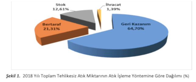 2018 yılında beyan edilen tehlikesiz atığın %64,70'i geri kazanılmak üzere atık işleme tesislerine gönderilirken %21,31'i bertaraf edilmek üzere düzenli depolama ve yakma tesislerine gönderilmiştir (Şekil 1).