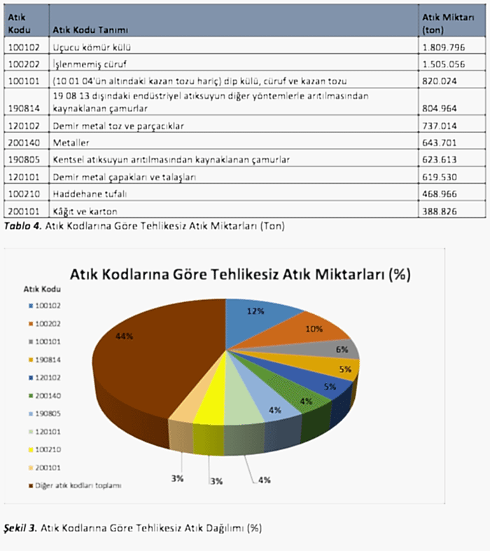 2018 yılında en çok beyanı gerçekleştirilen ilk 10 atık kodu ve miktarı aşağıdaki tabloda verilmektedir. 2018 yılında 256 atık kodunda beyan gerçekleştirilmiştir. En yüksek tehlikesiz atık beyanı yapılan 10 atık kodu, toplam beyanın %64’ünün oluşturmaktadır.